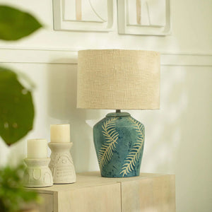 Adorn your tabletop with this serene Aamay table lamp. It is a hancrafted terracotta decor with a sky blue backdrop and white leaf paintings. Place it in your living room, bedroom, or recreational areas to furnish a calming appeal.