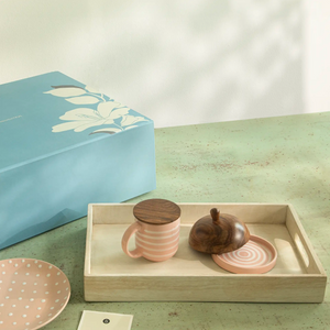 A gift for morning enthusiasts, this set features a ceramic breakfast plate with blush polka dots, ideal for toasts or croissants. It includes a striped ceramic mug with a wooden lid that doubles as a coaster and a matching butter dish with a rustic lid. All beautifully presented on an off-white mango wood tray. This ensemble creates an elegantly coordinated breakfast spread, perfect for starting the day with calmness.