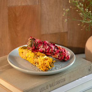 The Earth & Air set includes two smudge bundles , made with natural sage leaves and dried flowers. A simple way to refresh spaces, welcome new beginnings, or give as a thoughtful gift. Light up each bundle to fill the air with warmth and a subtle earthy scent, cleansing your aura and ambiance.