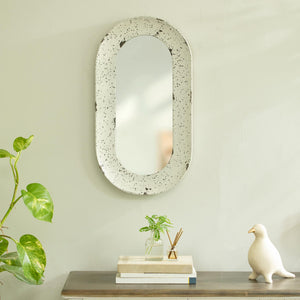 Bring home the allure of the countryside with this Farmhouse Flair mirror. It is handcrafted in an oval with a white speckled border. Place it in entryways or above the Farmhouse flair ready-to-assemble console with the square and round mirrors from the collection for a captivating sight.
