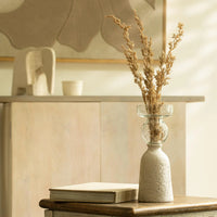 Less is always more, and with this decorative vase from the Kifa collection, there is more elegance to welcome home. Its eggshell white ecomix and glass fusion make it a lovely decor piece to flaunt. It is best to avoid keeping fresh flowers in this vase. You can place it just as it is or even fill it with colourful freeze-dried flowers.