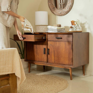Do you find yourself in awe of the aesthetics and decor of an era gone by? This cabinet with two drawers and two cupboards brings alive the old world charm with a modern touch. Locate this impressive furniture in bedrooms or shared spaces and open the cabinet doors or pull out the drawers to comfortably stack linen, crockery, and cutlery.