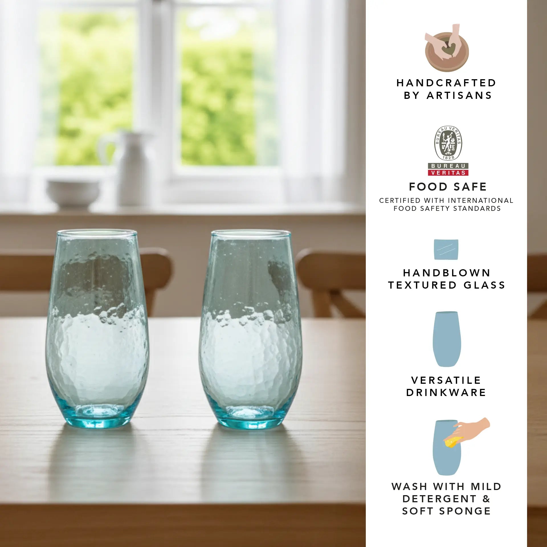 Glass glows the best when washed with warm, soapy water and a sponge. Keep it away from any abrasive materials and slippery hands.