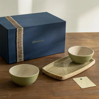 A delightful gift for those who love to celebrate. This gift box features a hand-painted Rayas mango wood platter, perfect for showcasing your favourite sweets and snacks with its striped design and enamel finish. Paired with a two-tone ceramic bowl, it’s an ideal ensemble for serving festive treats.